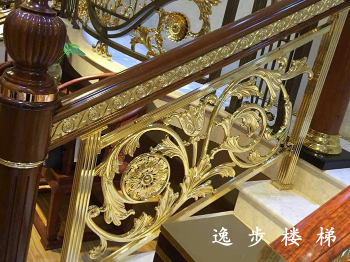 別墅旋轉(zhuǎn)樓梯銅藝欄桿邊框為50mm*50銅管,欄板為15mm銅板雕刻加銅花組成